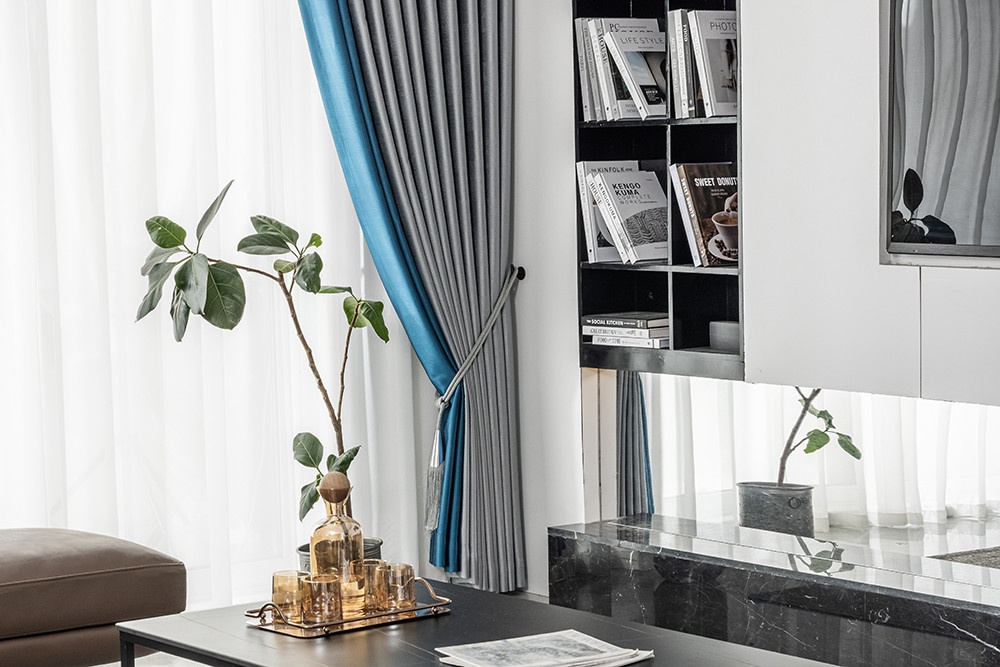 設計理念:以富于質(zhì)感的灰色系作為基調(diào)來裝飾這間客廳,營造著低調(diào)雅致的視覺觀感,作為點睛之筆的藍灰色軟裝側(cè)邊和大氣摩卡色真皮沙發(fā)上的抱枕呼應,令原本嚴謹?shù)目蛷d更多了一份靈氣與舒心。