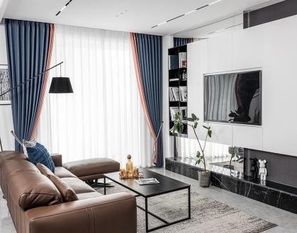 設(shè)計(jì)理念:以藏藍(lán)作為主題色彩來(lái)打造輕奢風(fēng)范的客廳空間,配搭純潔的白色,將渾然天成的貴族氣質(zhì)極致凸顯,再配搭深棕真皮沙發(fā)、魅影黑電視柜和茶幾等極簡(jiǎn)元素,打造奢美吸睛效果。